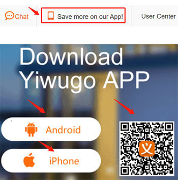 Visit the official Yiwugo website and click the link “Save more on our App!” at the top: Download options are available for both Android and iPhone.